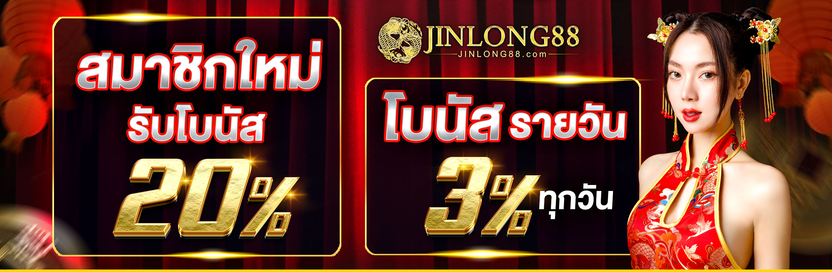 สำหรับสมาชิกใหม่ที่เพิ่งสมัครเข้ามา Jinlong88 มอบโบนัสต้อนรับสุดพิเศษถึง 100% สูงสุด 10,000 บาท เพียงฝากเงินครั้งแรกขั้นต่ำ 300 บาท คุณก็จะได้รับเครดิตเพิ่มทันที นอกจากนี้ยังมีฟรีเครดิต 100 บาทให้ทดลองเล่นโดยไม่ต้องฝากเงิน เรียกได้ว่าเป็นการต้อนรับสมาชิกใหม่อย่างอบอุ่นเลยทีเดียว